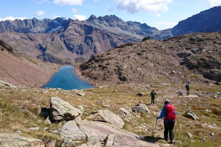 Vandaag is het slechts 250 meter klimmen naar de laatste col van de reis. Col de Livournea is de hoogste col van deze reis. Hierna is het alleen nog maar in dalende lijn. Maar vergis je niet, het eerste stuk van de afdaling naar het stuwmeer, lac de Places Moulin, loopt door rotsachtig terrein. We moeten dus goed opletten. Gelukkig wordt het hierna gemakkelijker en genieten we van de laatste echte wandeldag. We overnachten en sluiten de reis af in de bemande hut die verscholen ligt op een adembenemende plek en omringt door 4000-ers.
