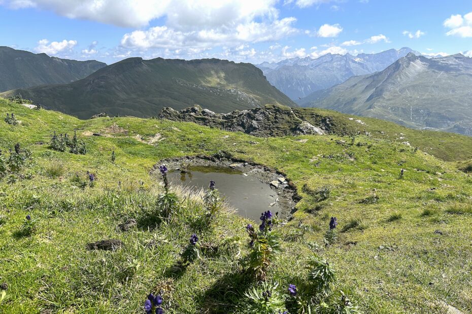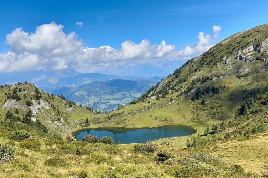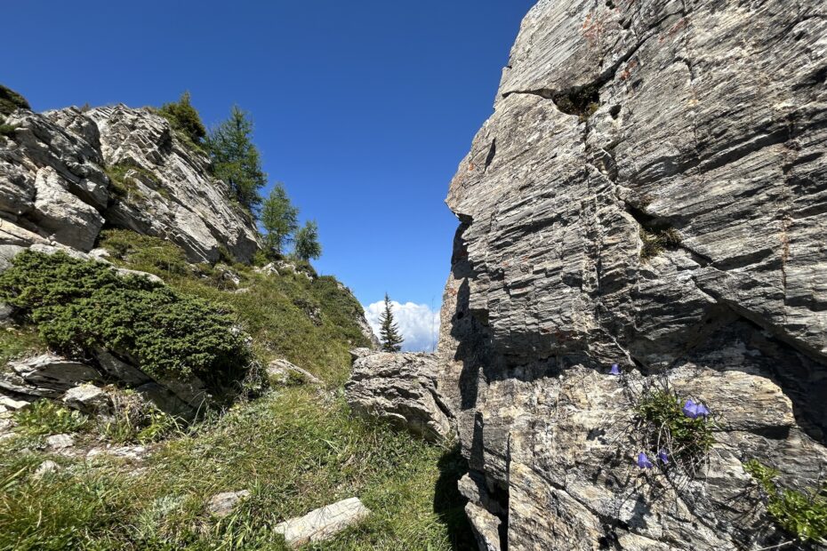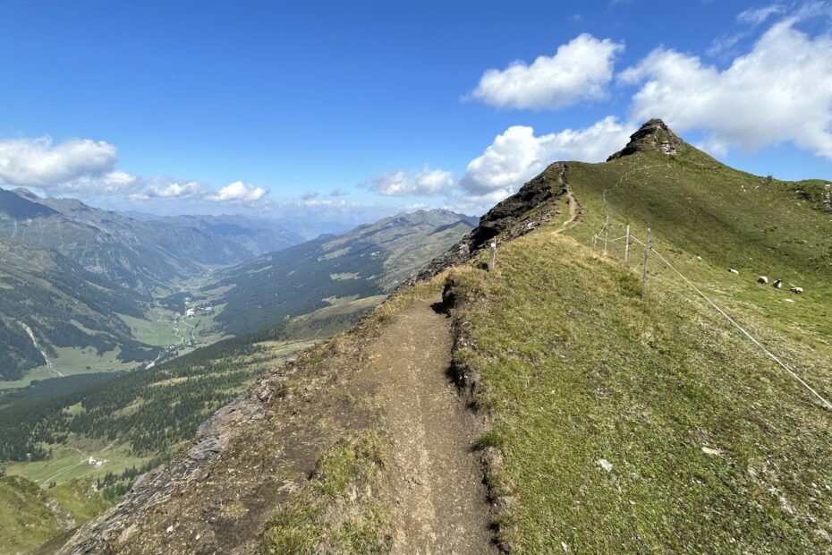 We lopen snel richting de bossen waar we het pad oppakken dat ons naar de graat leidt. Vanaf hier zien we het kruis op de Schuhflicker al in de verte. Eenmaal de top onder handbereik wordt het wat steiler en rotsachtiger. Gelukkig zijn er kabels om ons aan vast te houden. Op de top kijken naar het Gasteinertal aan de ene zijde en het Grossarl dal aan de andere zijde. Afhankelijk van hoe we ons voelen nemen we een korte, een middellange of een langere route (via de graat de ander kant op) weer terug naar het liftstation.