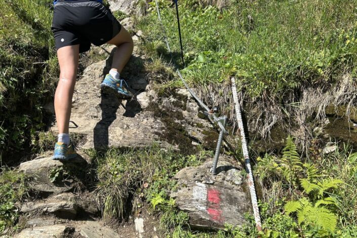 Vervolgens gaan we in wandelpas steil omhoog. Een erg afwisselende trailrun waar we noodgedwongen deels lopend en hikend doen. Tredzeker is wel belangrijk op sommige stukken.