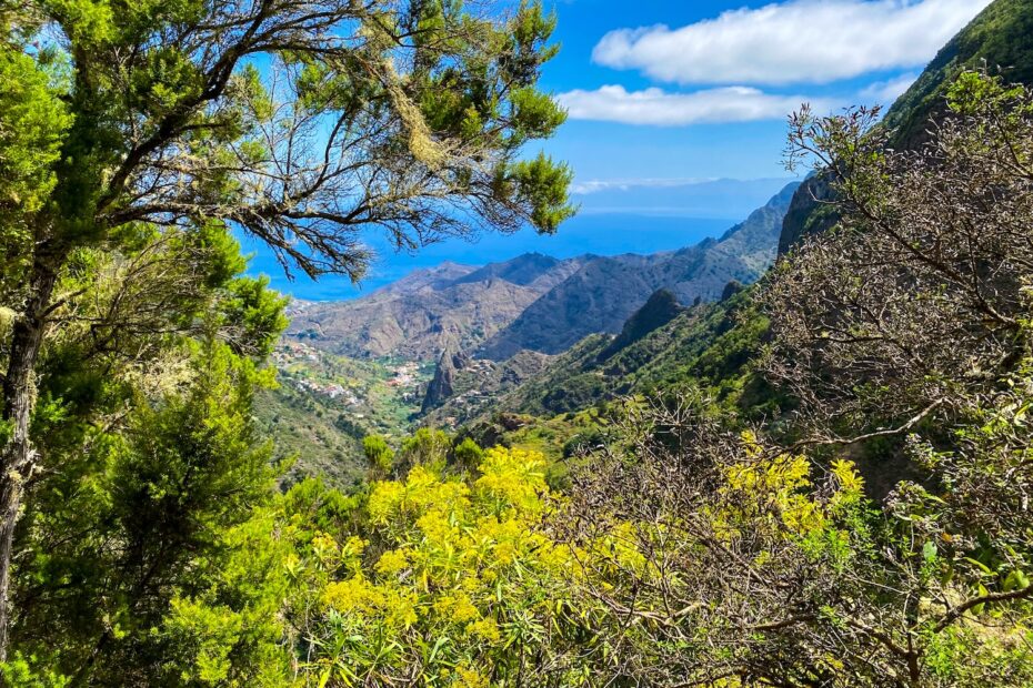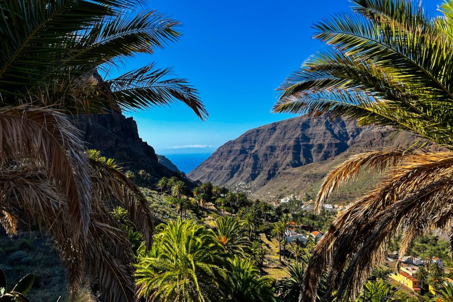 De tocht naar Vallehermoso is misschien wel de mooiste van deze reis. Je wandelt door het hart van het laurierbos, passeert steile bergflanken en loopt langs Roque Cano, een imposante rotsformatie die hoog boven het landschap uittorent. Tijdens de afdaling verandert het decor: van weelderig groen naar tropische valleien vol fruitbomen en bloemen. In het dorp Vallehermoso sluit je de dag af op een terras met lokale lekkernijen.